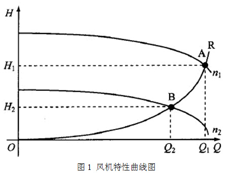 風機特性如圖1所示。風機工作在A點時,其功率為PA=H1×Q1/102;風機工作在B點時,其功率為PB=H2×Q2/102。因Q2H1,故PA與為PB的值變化較大,說明采用變工頻工作方式時,改變風機的風量,風機的軸功率減小很大,節(jié)能效果顯著。