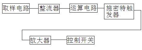 本實(shí)用新型的變工頻軟切換控制裝置,是由取樣電路、整流器、反向比例電路、濾波器、施密特觸發(fā)器、放大器與控制開關(guān)依次串接而成。其特點(diǎn)為: