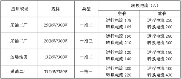 我們公司在青海油田應(yīng)用了幾套大功率一拖多的控制柜,從調(diào)試的情況看,轉(zhuǎn)換效果都比較理想?,F(xiàn)將轉(zhuǎn)換試驗(yàn)的效果列出表格,如下: