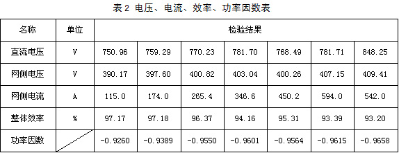 我公司做的大功率可再生能源回饋并網(wǎng)裝置經(jīng)鐵道部產(chǎn)品質(zhì)量監(jiān)督檢驗(yàn)中心檢驗(yàn)證明:具有輸出功率大、網(wǎng)側(cè)電流波形好、整體效率高等特點(diǎn)。表2是功率因數(shù)、直流側(cè)輸入電壓、網(wǎng)側(cè)交流電流及整體效率的簡(jiǎn)表。