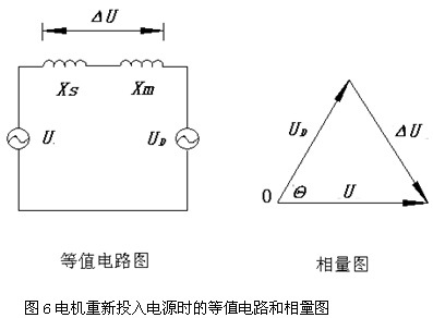 從圖4和圖5中可以看出,瞬間斷開電源后,電機(jī)感應(yīng)電壓有所衰減,同時(shí)感應(yīng)電壓與工頻電源電壓的相位已開始拉開,不同時(shí)刻投入工頻電源,將會產(chǎn)生不同的△U。圖6是電機(jī)重新投入電源時(shí)的等值電路和相量圖。