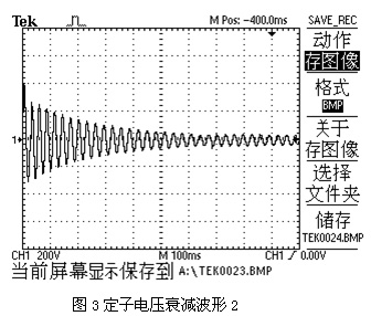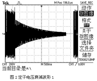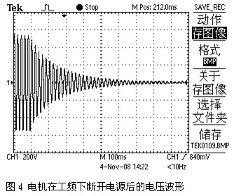 由于變頻器輸出的是PWM波,其相位不易觀察,測得在工頻狀態(tài)下的電壓波形進(jìn)行進(jìn)一步的分析。因?yàn)樽冾l器50Hz時(shí)的輸出電壓與工頻電壓作用在電機(jī)上基本時(shí)等效的,并不影響分析結(jié)果。圖4是一2.2KW電機(jī)在工頻電源下突然斷開電源后的電壓波形圖,由該圖可以看出,電壓波形沒有跳變,所以斷開瞬間感應(yīng)電動勢與電源電壓是同相位的,其幅值也是基本相等的。隨著剩磁的慢慢消失,電壓幅值逐漸降低,同時(shí)伴隨著轉(zhuǎn)速的降低感應(yīng)電動勢的頻率逐漸下降,其相位也逐漸與電源相位拉開。頻率越低,單位時(shí)間內(nèi)拉開的相位差也就越大。