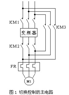 變頻運(yùn)行的電動機(jī)切換成工頻運(yùn)行的主電路如圖1所示。切換的基本過程只有2個(gè):