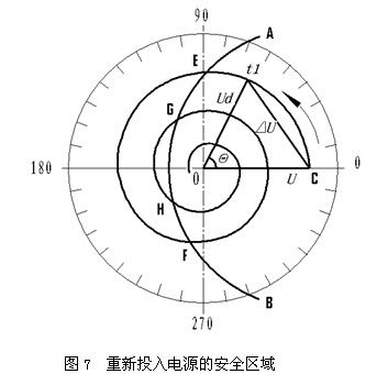 H點(diǎn)以后三個(gè)安全投入工頻電源的時(shí)間范圍,都是由相位和幅值共同作用的結(jié)果。我們也還可以分別從相位和幅值兩個(gè)方面入手來尋求解決辦法。