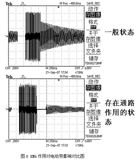 KM4作用對電動勢影響對比圖。由圖9可以看出,KM4提供通路的作用時(shí)間約為300ms,作用后該時(shí)刻與一般狀態(tài)同一時(shí)刻的感應(yīng)電動勢幅值相比幅值小了很多。適當(dāng)控制KM4的作用時(shí)間,讓其幅值減小到額定電壓的三分之一以下就可以了。這樣,即使切換至工頻電源時(shí)刻感應(yīng)電動勢與工頻電源的相位相差180°,△U也不會超出其許可的安全范圍了。在KM4的作用過程中,會加快電機(jī)的轉(zhuǎn)速下降,但通過試驗(yàn)得知,KM4的作用對電機(jī)轉(zhuǎn)速的影響比對感應(yīng)電動勢幅值的影響要顯得多。