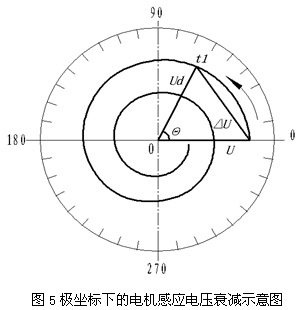 據(jù)此,繪出斷電后電機(jī)感應(yīng)電壓Ud在極坐標(biāo)下衰減的向量示意圖,如圖5中Ud所示。
