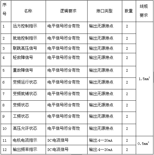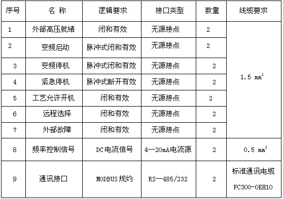 ?。?)外部高壓就緒,故障輸出,報警輸出,就地指示,遠程指示,變頻指示,工頻指示,遠程急停,遠程開機,遠程停機,遠程頻率給定,電流輸出,頻率輸出,工藝允許,聯(lián)跳外部高壓等。