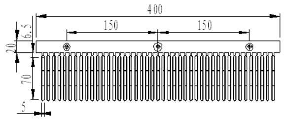 按照器件均勻布置的原則,所需散熱片寬度約為300~400mm,選400mm;長度約為450~600mm.選480mm。