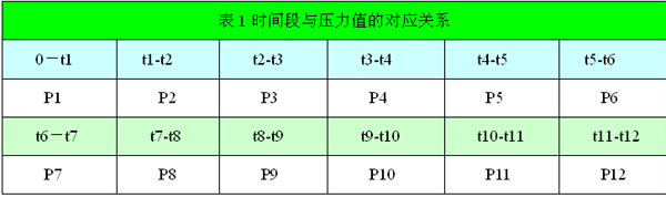 變頻器人機(jī)界面在運(yùn)行中根據(jù)實(shí)際運(yùn)行時(shí)間自動(dòng)按照設(shè)置好的壓力值賦值到主控,然后變頻器主控將運(yùn)行頻率調(diào)整至該壓力值對應(yīng)的頻率,時(shí)間段與壓力值的對應(yīng)關(guān)系如表1所示。