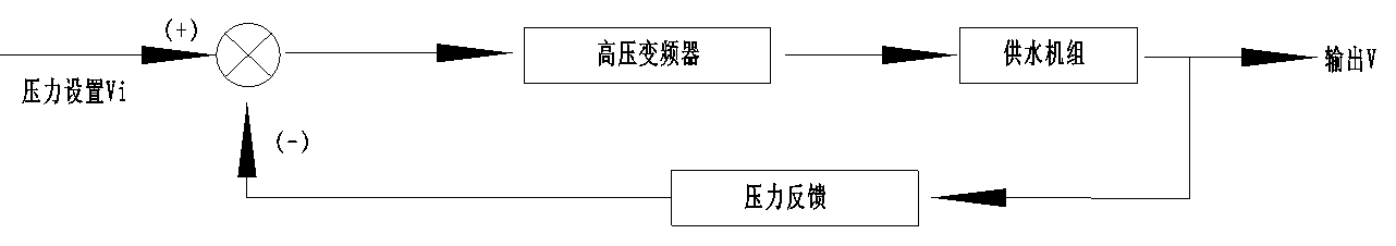 為滿足不同時(shí)段不同地區(qū)的用水壓力需求,該水廠采用先進(jìn)的恒壓供水控制系統(tǒng),可以對水廠出口處的水壓值V進(jìn)行精確的處理和控制,并與壓力設(shè)置值Vi構(gòu)成閉環(huán)控制系統(tǒng)。恒壓供水系統(tǒng)原理如圖2所示。變頻器內(nèi)部的主控DSP采集供水壓力值V與用戶給定值Vi進(jìn)行比較和運(yùn)算,通過PID進(jìn)行調(diào)整,將結(jié)果轉(zhuǎn)換為頻率調(diào)節(jié)信號(hào)送至變頻器,直至達(dá)到供水壓力的給定值Vi。不管系統(tǒng)供水流量如何變化,供水壓力值V始終維持在給定壓力值Vi附近。