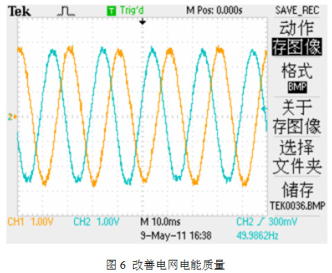 響應(yīng)速度小于5ms,對于電網(wǎng)電壓的跌落和閃變具有一定抑制作用并網(wǎng)波形(如圖6所示):