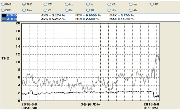 經(jīng)過(guò)認(rèn)真安裝調(diào)試,SVG裝置按用戶要求,2016年9月已投入正常運(yùn)行,現(xiàn)按功率因數(shù)自動(dòng)補(bǔ)償運(yùn)行,功率因數(shù)設(shè)定值為97%,投運(yùn)后工作正常,用戶十分滿意。根據(jù)用戶要求,在安裝調(diào)試完畢后對(duì)機(jī)械鑄造廠高壓側(cè)進(jìn)行了諧波補(bǔ)償效果并進(jìn)行了測(cè)試。