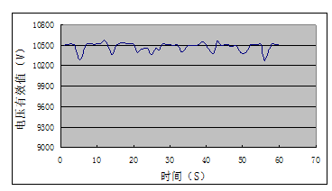 FGSVG運(yùn)行后無(wú)功功率補(bǔ)償效果非常理想,系統(tǒng)側(cè)平均功率因數(shù)穩(wěn)定在0.95以上,系統(tǒng)側(cè)的無(wú)功功率降低到300kvar以下。FGSVG投運(yùn)后對(duì)沖擊性無(wú)功功率快速補(bǔ)償,有效的抑制了電網(wǎng)電壓的閃變,電網(wǎng)電壓最大波動(dòng)200V,基本穩(wěn)定在10500V附近,保證了用電設(shè)備的安全運(yùn)行,如圖4所示。