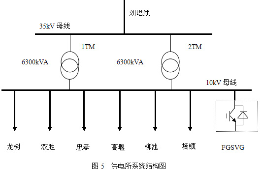 塔山供電所位于三臺縣東路的塔山場鎮(zhèn),現(xiàn)有6300kVA主變兩臺,全年供電量2000多萬kW·h。轄區(qū)35kV劉塔線路一條18.6公里,10kV線路共六條共計(jì)312.3公里,共計(jì)量用戶27905戶,現(xiàn)在10kV母線上裝設(shè)2000kvar的SVG一臺。供電系統(tǒng)結(jié)構(gòu)如圖5所示。